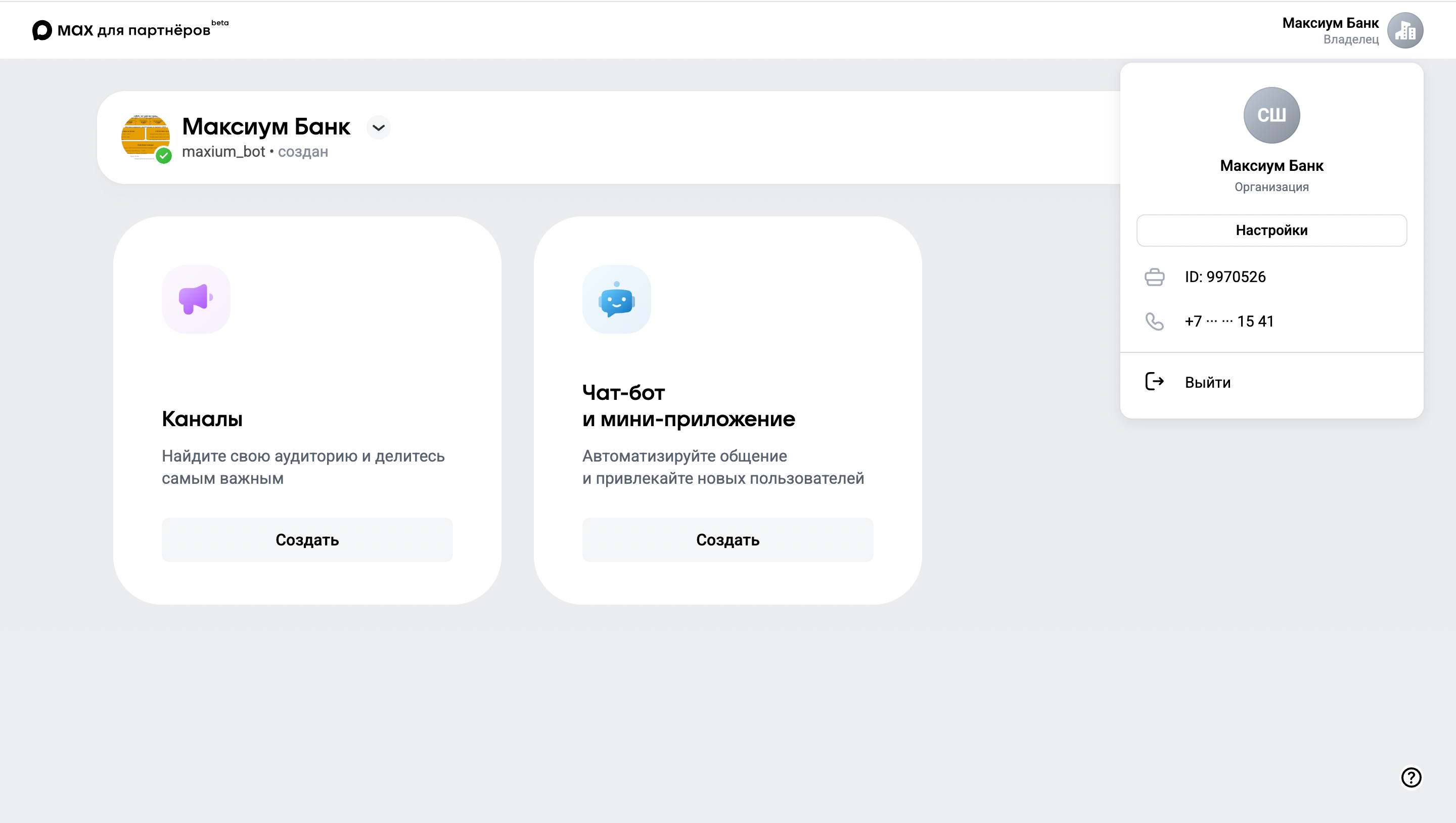 Перейдите на платформу MAX для партнёров и в правом верхнему углу нажмите на профиль организации. В открывшемся блоке вы увидите: